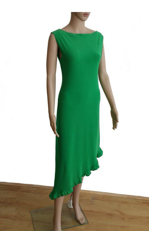 Simple, no frills, soft, body friendly stretch crepe latin dress. Model height is 5ft 8in ( 172cm) and her dress Length from top of shoulder to the lowest point is 45 inch (115cm), in the shortest place 34in (86cm). Other lengths available. It can be worn with longer side on the left or on the right.