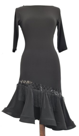 Soft, body friendly stretch crepe. This dress is the same as E-DR091 Simple Ballroom/Latin Practice dress, but it has a narrow see-through lace section above the frill and the frill is covered with fringe.