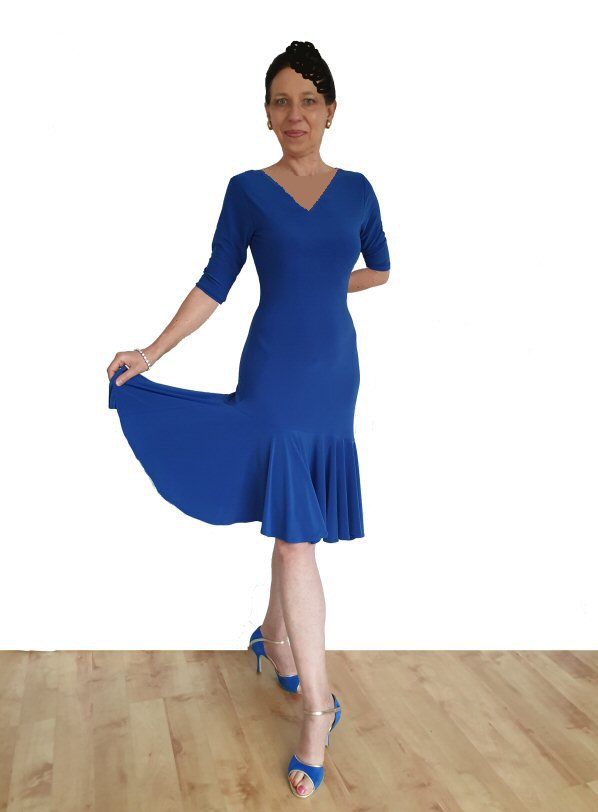 Beautiful lines and beautiful flow are the features of this dress, which can be used for Latin, Salsa, Bachata, Tango and more. The dress is built on a body which means it will never pull up and you can kick your legs very high without worrying that you reveal too much. Made in stretch crepe, the dress will adapt to your shape easily. The fabric is easy care: machine washable, dries quickly and does not require ironing.