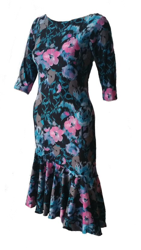 E-DR228F Open back, Long sleeve Latin dress WITH FLORAL PRINT GODETS - Price £90.00 excl.VAT