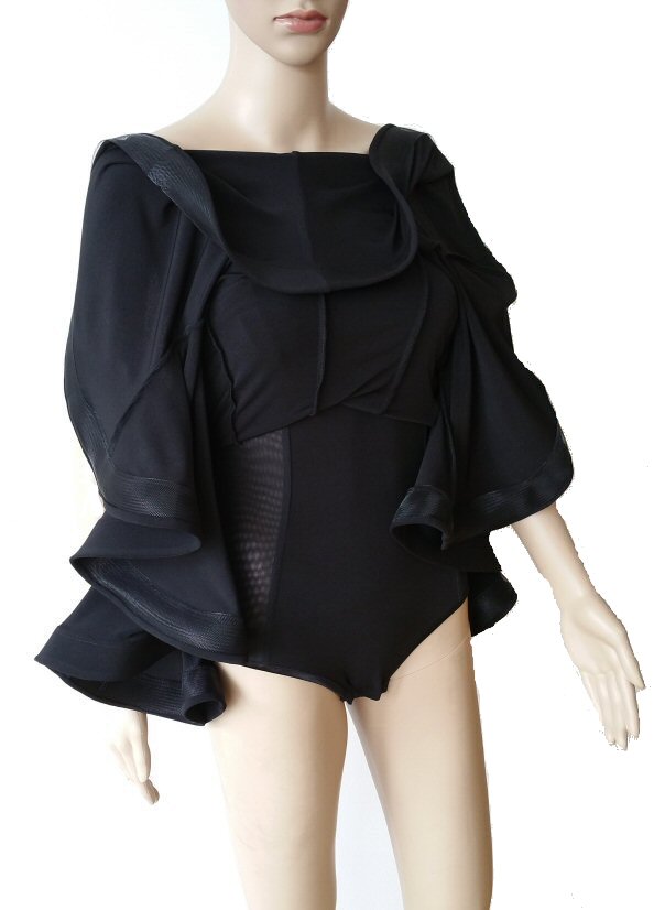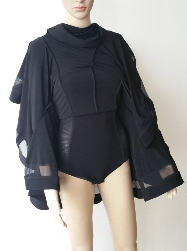 This dress is similar to DR091, but has an asymmetrical mesh insert on one shoulder and sleeve. Model height is 5ft 8in (172cm) and her dress Length is: Longer side 47" (120cm), Shorter side 38" (96 cm). This dress can can be worn either way: with the longer side on the left or on the right.