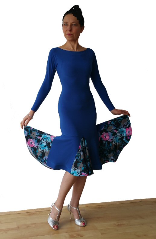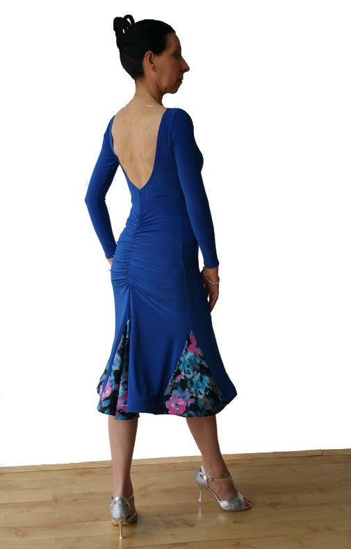 Long sleeve Open back Latin dress. Blue/ Flower print