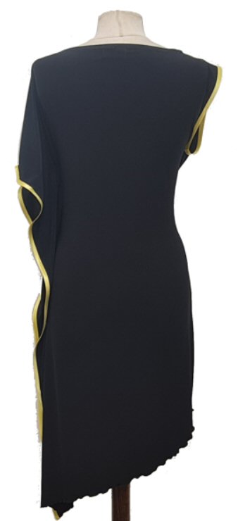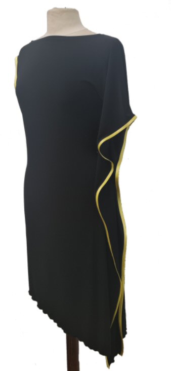 Asymmetrical design latin dress with contrasting colour satin trim. Machine washable, dries quickly and does not require ironing. Model height is 5ft 8in ( 172cm) and her dress Length from top of shoulder to the lowest point is 45 inch (115cm), in the shortest place 34in (86cm). Other lengths available. It can be worn with longer side on the left or on the right.