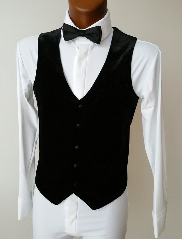 This waistcoat is made with the same velvet and matches our E-MTR102V Ballroom/Latin trousers with velvet stripes.