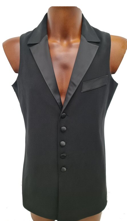 The front of this waistcoat is made from the same fabric as our E-MTR102 Ballroom/Latin trousers. Satin lapel at front in traditional smoking style. Fake pocket on the left side. Black only.