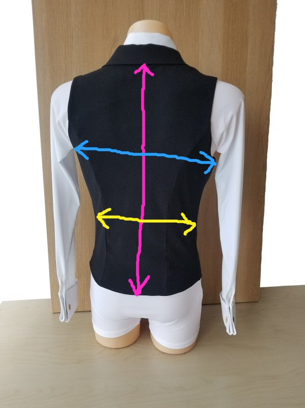 This long line waistcoat can be called a "jacket without sleeves". It is made from the same fabric as our E-MTR102 Ballroom/Latin trousers and finished with satin at front. Fake pocket on the left side. Unlike previous waistcoats it is made from the traditional trousers fabric on front and back, therefore not elastic.