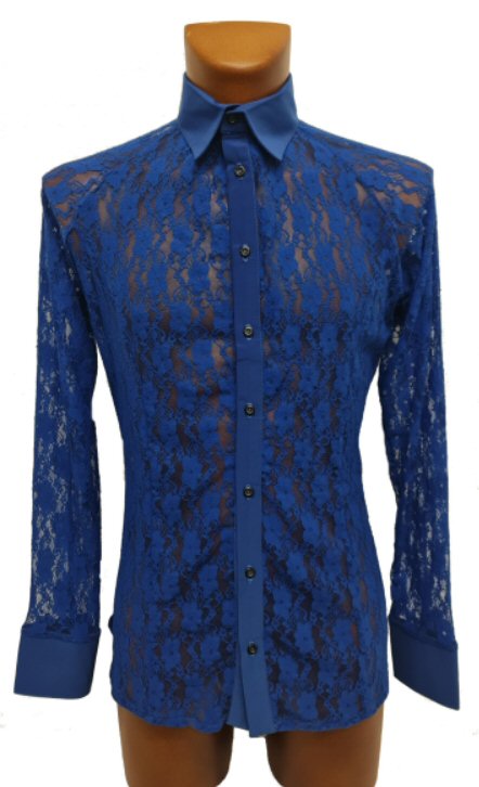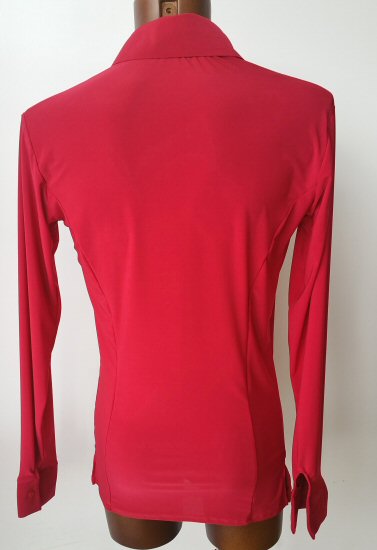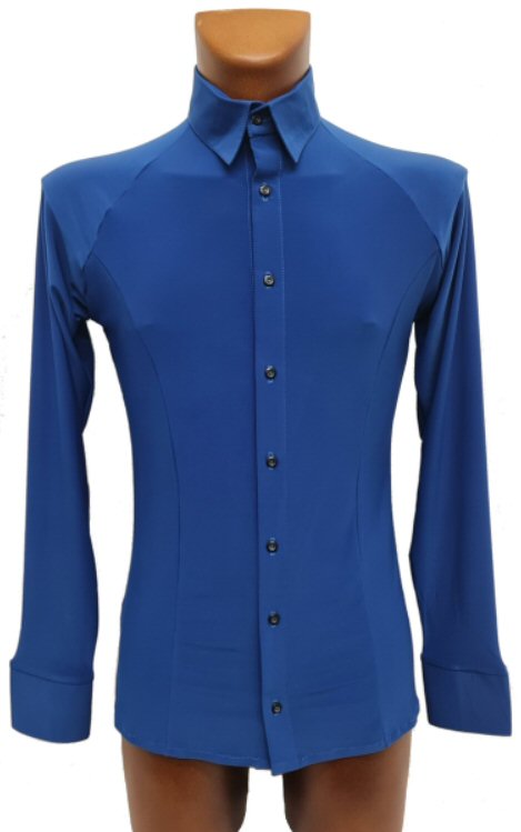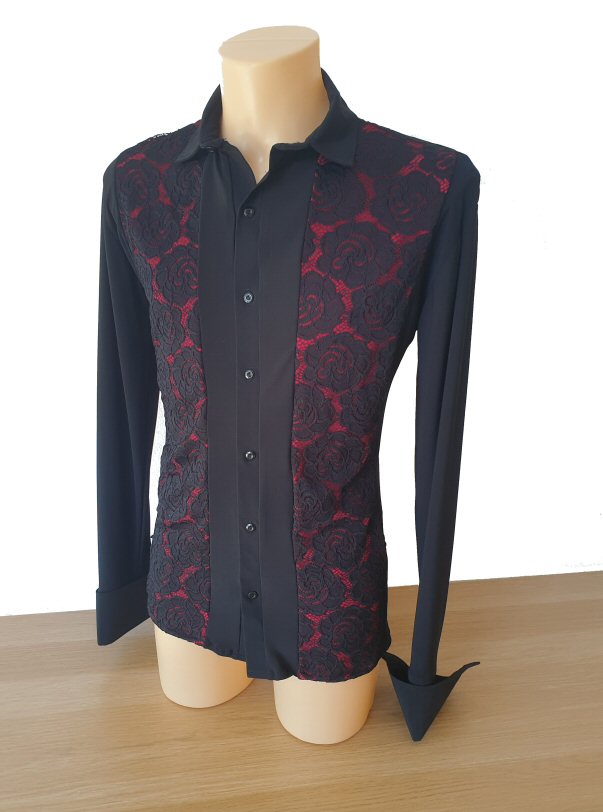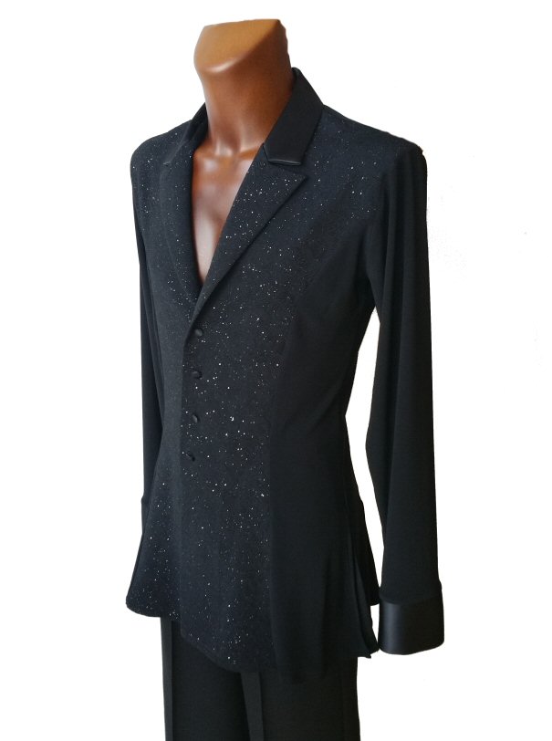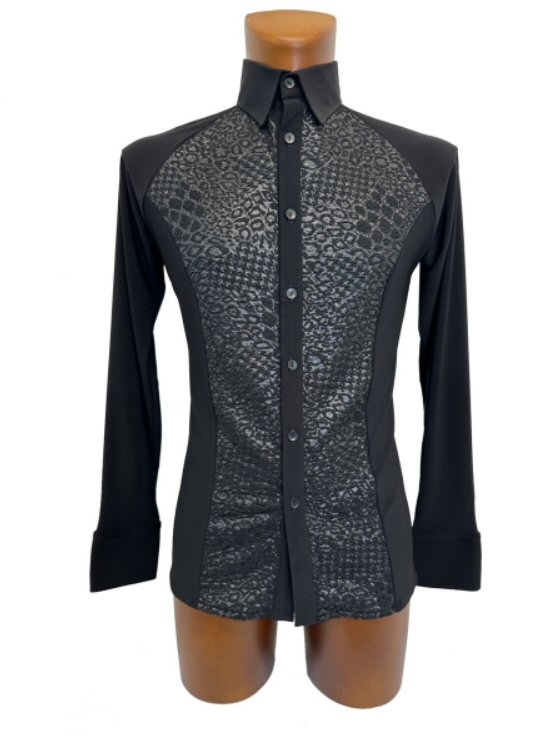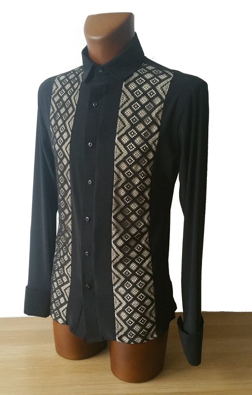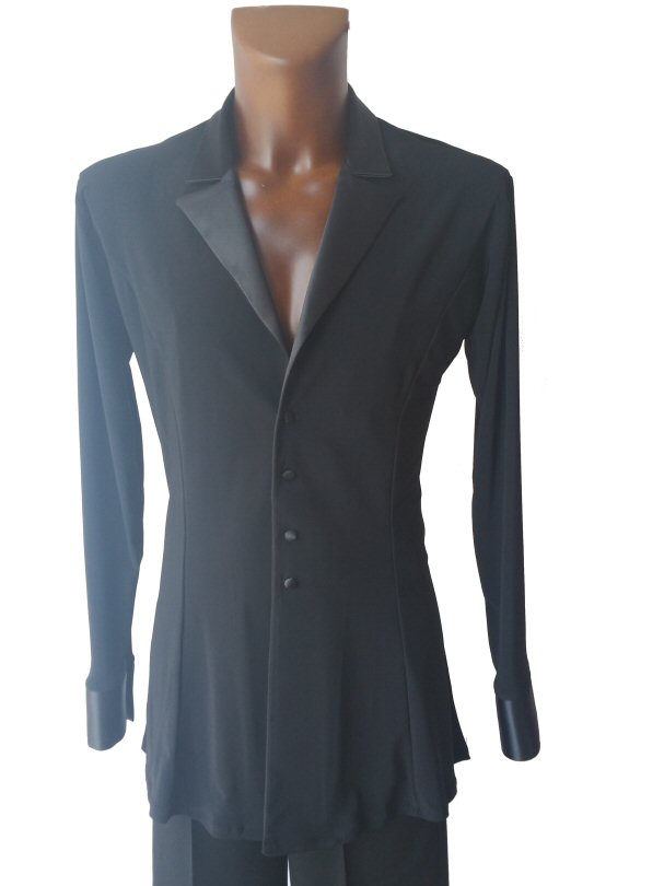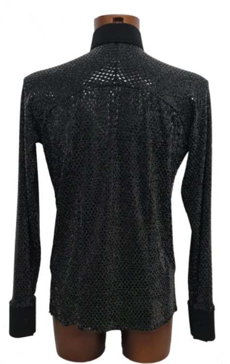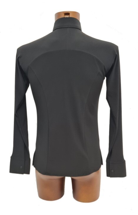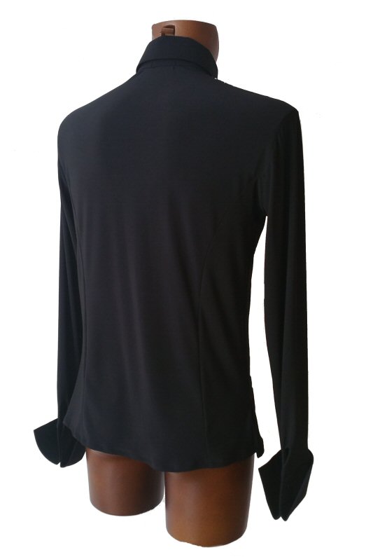 Raglan cut latin shirt made of stretchy velvet stripe fabric. Single cuff with button. Black. |