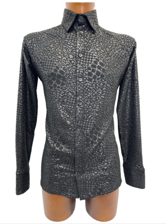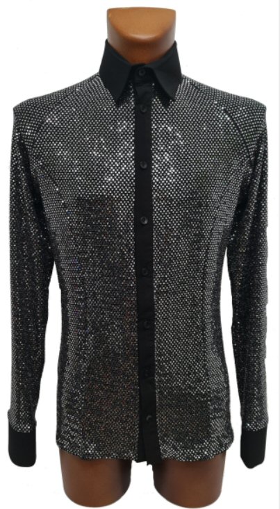 Silver Sparkle Pinstripe Raglan cut, stretchy shirt. Single cuff with button. Black. |