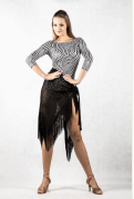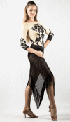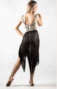 Elegant latin skirt made of liquid silk and stretch lace, finished with long fringe for dramatic movement when dancing. Hand wash or delicate machine wash. Skirt length 80cm.