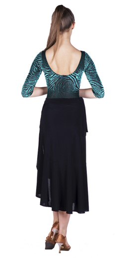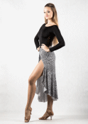Cheeky latin skirt made of liquid silk and sheer mesh inserts. Nice flowy movement when dancing. Hand wash or delicate machine wash. Skirt length 75cm.