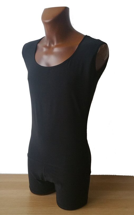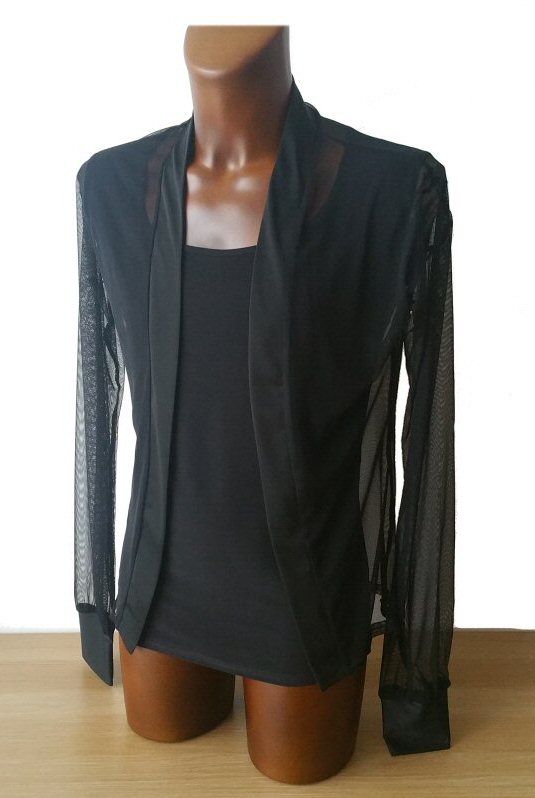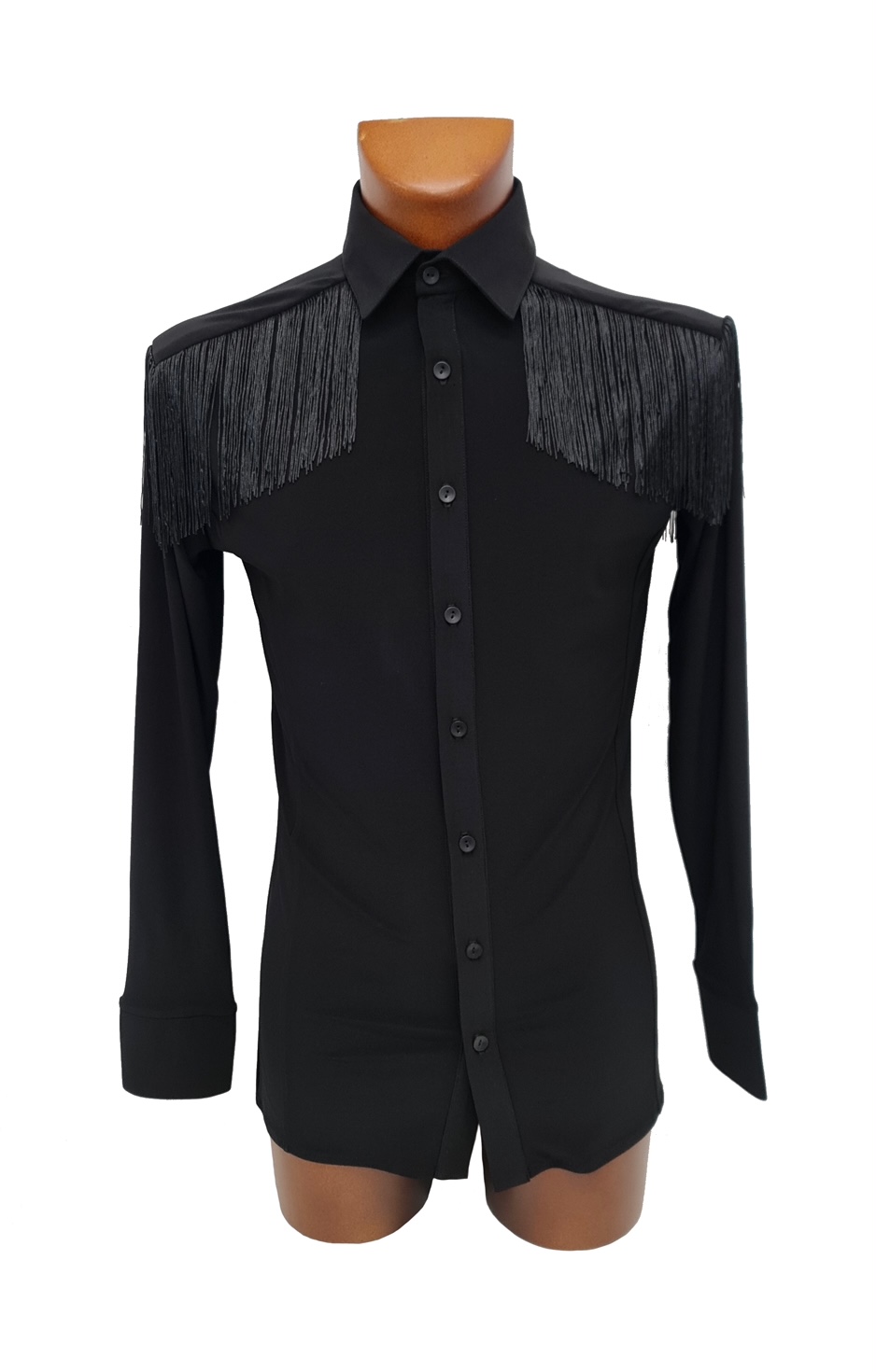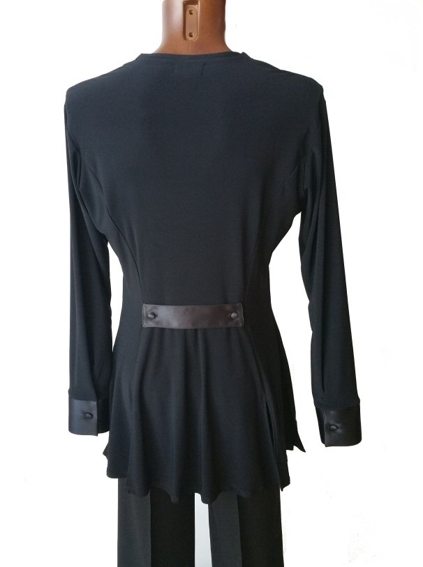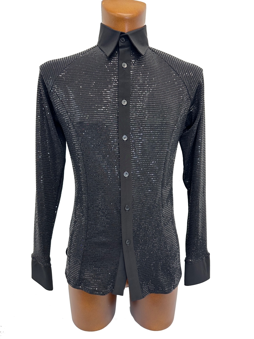 Raglan cut latin shirt made of stretchy velvet stripe fabric. Single cuff with button. Black. |