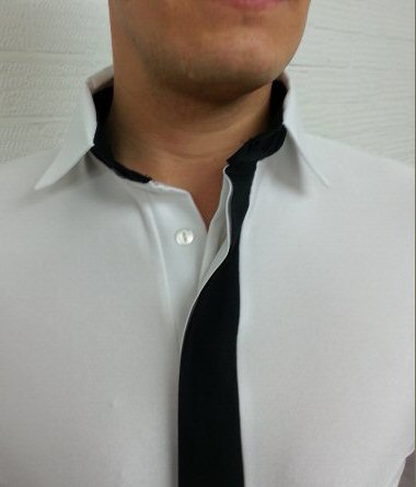 Soft, two way stretch crepe. This shirt is built on boxer shorts, so it will not pull out from your trousers. It also has a fake tie as part of the shirt design, so you do not have to wear a real tie or bow-tie.