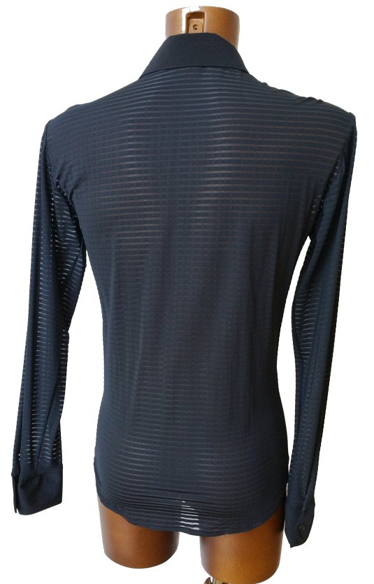 Semi-see through stripe fabric on the sleeves, the back and body sides. Solid black stretch crepe on the front. Traditional collar, buttons and button cuffs. The collar size goes in proportion with the body size and it is slightly larger, but this type of shirt is best worn with top button open, so you do not need an exact collar size. This is a shirt only, no underpants built-in. Black only.